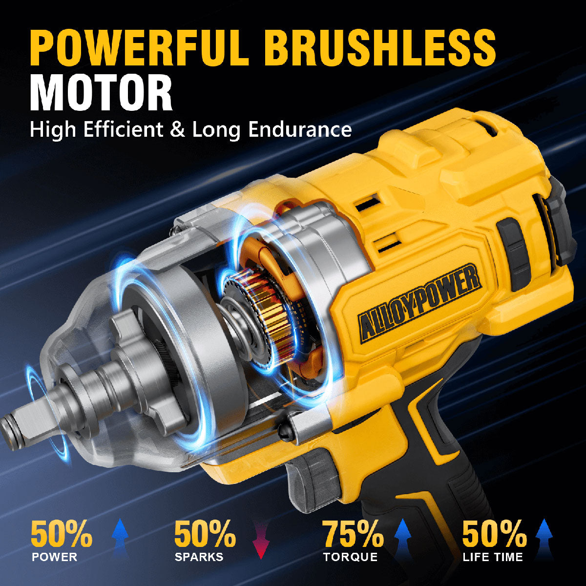 ALLOYPOWER Cordless Brushless Impact Wrench, 1475 ft-lbs (2000N.m), 1/2 High Torque power impact gun, 3-Mode Speed, 4000mAh Battery, 3 Sockets